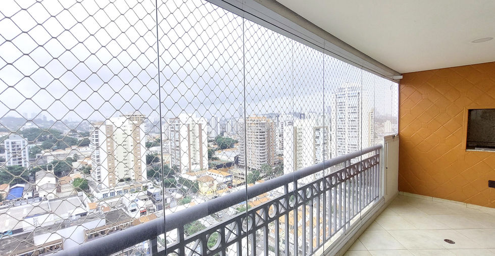 Living para 3 confortáveis ambientes, com ar condicionado e varanda gourmet. Varanda com janelas de vidro, com fechamento e redes de proteção.
