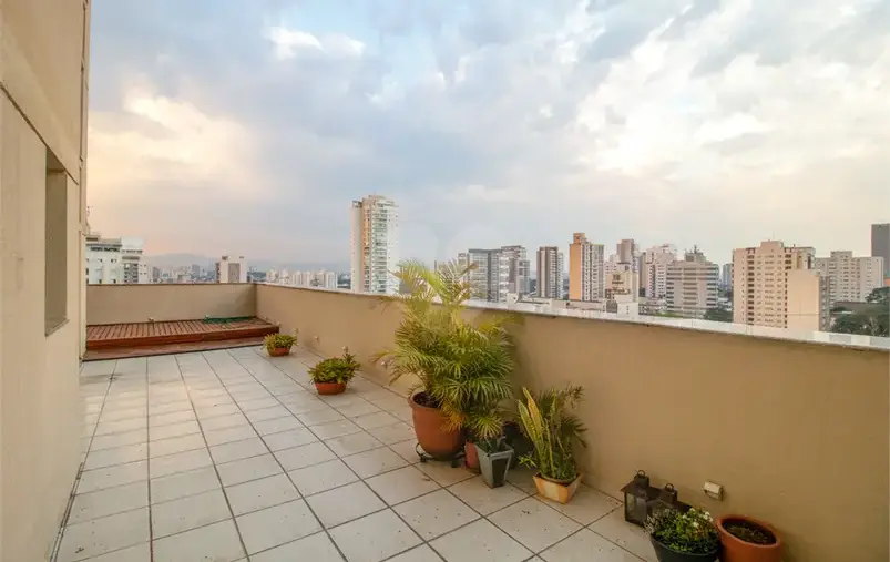 Living com sofás e poltronas, mesa de jantar com poltronas para 8 lugares, escritório com 2 poltronas. Amplo e aprazível terraço, todo envidraçado, com mesa para 4 lugares, sofá e poltronas, espreguiçadeiras, com muita luz natural com linda vista para a Serra da Cantareira, Pico do Jaraguá e o pôr do sol.